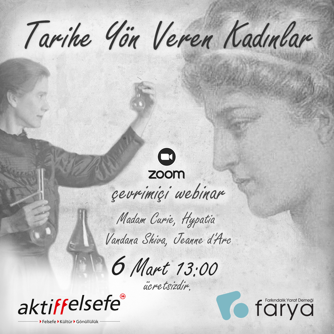 Online (Zoom)Çevrimiçi Webinar 6 Mart 2021 Cumartesi Saat 13.00 Etkinliğimiz ücretsizdir. "Fırtınalı bir dünyada araya girmenin en rahatlatıcı ve en güçlü yolu; ayağa kalkıp, ruhunuzu göstermenizdir." Clarissa P. Estes Aktiffelsefe Kültür Derneği ve Farya Farkındalık Yarat Derneği iş birliği ile Dünya Kadınlar Gününde kadının iç gücünü, kapasitelerini ortaya çıkarabilmesi için tarihsel örneklerden ilham alıyoruz. Sen de […]