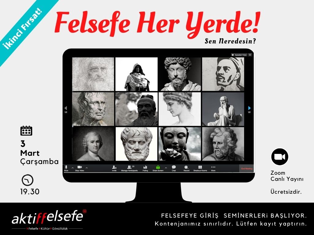 Online (Zoom)1989 yılından beri düzenlediğimiz temel felsefe, psikoloji ve gönüllülük seminerlerimiz pandemi sürecinde de devam ediyor, hem de çevrimiçi ortama uyarlanmış olarak. Aktiffelsefe’de bu maceraya sen de katılmak ister misin? Felsefe bize kendimizi tanımayı, içimizdeki iyi ve kötünün sonsuz mücadelesini, toplumsal ahengi oluşturanın kendimizle uyumlu bir birlikte yaşamın sonucu olduğunu hatırlatır. Tarihteki yerimizi görmemize ve var […]