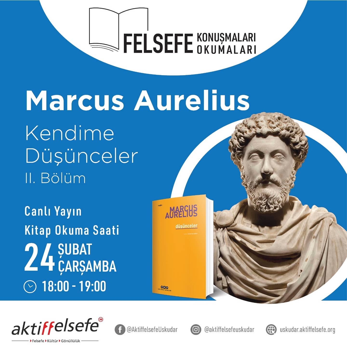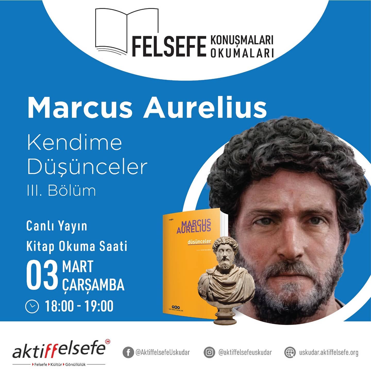 Online (Zoom)Felsefî Kitap Okuma Saati Hepbirlikte kitap okumaya devam ediyoruz?? Felsefe Konuşmaları? Felsefe Okumaları? 3 Mart Çarşamba, 18:00-19:00 Her hafta Çarşamba günü birlikte felsefi metinler, kitaplar okuyoruz. Yarın, Marcus Aurelius'un Kendime Düşünceler kitabına kaldığımız yerden devam ediyoruz. Katılım için aşağıdaki linki tıklayıp kayıt olmanız yeterlidir. https://us02web.zoom.us/meeting/register/tZwpduyhqDkrGdVIr7u-1vfYmj_BbIp1CTdp Tüm kitapsever, okur dostlarınızı da davet edebilirsiniz. Yarın kitap okuma […]